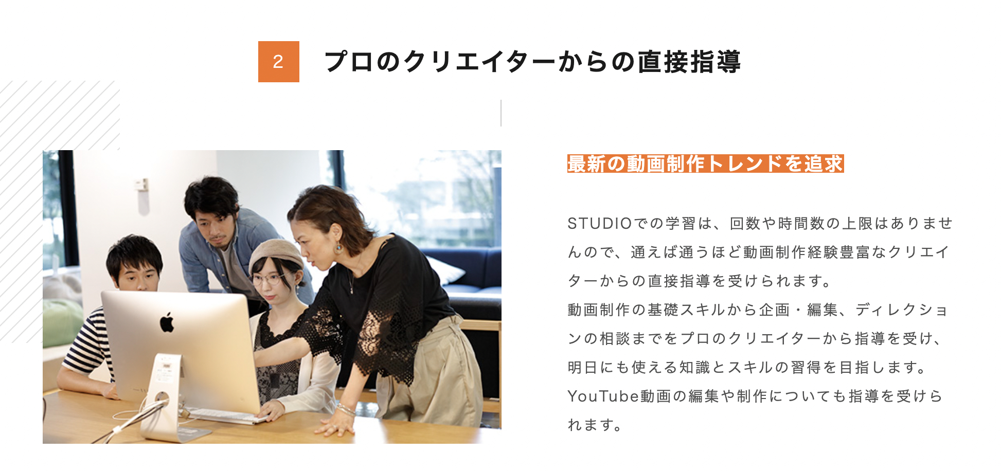 一番で選んだ理由は動画編集スクールの中で知名度が抜群にあったというところです。 最初スクールに通った時かなりの設備の豪華さに驚き身じろぎしたのを覚えています。本当にテレビの収録現場に来ているようなそんなスタジオの機材が整然と並べられていて動画の編集だけではなくカメラや撮影機材についてもきちんとした設備が整っているので驚いたのことを覚えています。そういった設備が整っているため動画編集についてもうまく指南していただき最新の機材で十分に私のような若輩者にも懇切丁寧に教えてもらえました。実際に自分が持っている家庭での環境を視野に教えていただき、今後、卒業したのちも自分でどのように編集していけば良いのかといったようなところまで細かく教えてもらえたのはすごく良かったですし、実際に家庭で自分で動画を編集する際にもとても役立ちました。